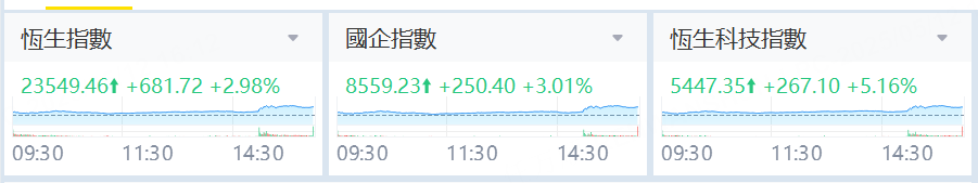 2025年5月12日,港股市场收盘普涨。恒生指数上涨2.98%,国企指数上涨3.01%,恒生科技指数上涨5.16%,红筹指数上涨2.00%。