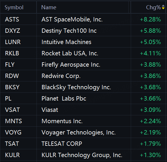 Space stocks jumped in morning trading. AST SpaceMobile rose 8%; Destiny Tech100 rose 6%; Intuitive Machines rose 5%; Rocket Lab, Firefly Aerospace, Redwire, BlackSky, and Planet Labs rose 4%; Viasat, Momentus, Voyager, and Telesat rose 2%; KULR Technology rose 1%.