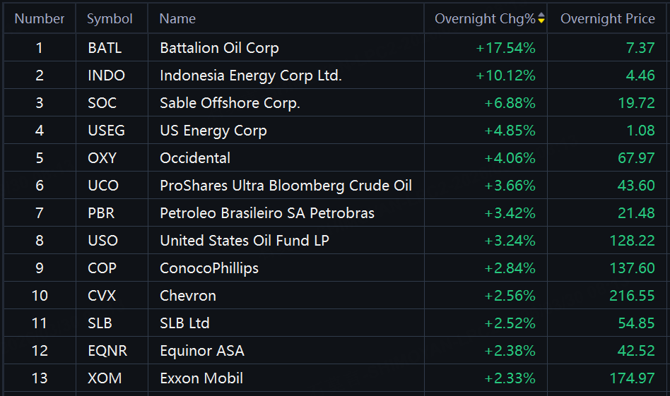 Battalion Oil soared 17%; Indonesia Energy up 10%; Sable Offshore up 7%; US Energy up 5%; Occidental up 4%; UCO, USO up over 3%.