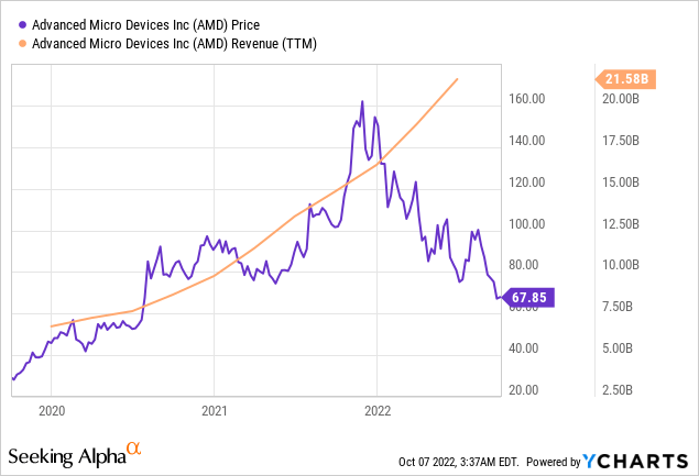 AMD (NASDAQ: AMD) is down more than 60% from its highs as the market is pricing in fears of recession and a slowdown in growth in the near term as uncertainties in the sectors increase. With so much negative sentiment around the stock, I think that this is the time to buy the stock as the company is one of my preferred stocks to own when the recession is over. This article aims to look at how much of the negatives has been priced in and what the recent preliminary 3Q22 numbers means for AMD.