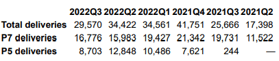 Its revenues amounted to $960 million in Q3 (+19.3% YoY), being slightly below estimates, while its EPS loss of $0.36 was 7% worse than expected, as shown in the previous table. During the third quarter of 2022, XPeng delivered more than 29,000 units, of which the majority were from the P7 model (close to 17,000 units), while the P5 model was responsible for about 8.7k units.