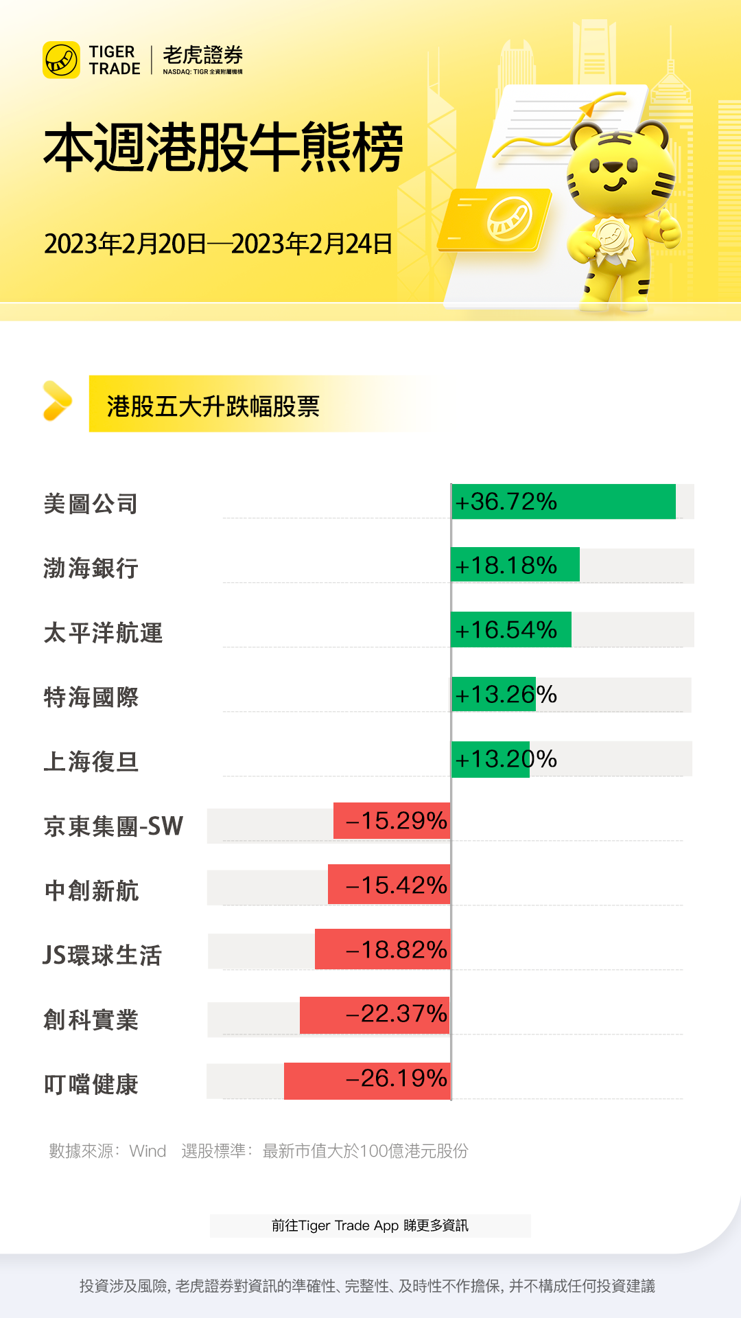 本週大市總體下挫,但仍有五隻股票保持強勁升勢,AI概念的美图公司 升得最勁,有逾36%的升幅。渤海銀行宣佈設置首家理財子公司,本週股價亦有喜人表現。