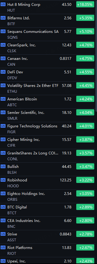 Crypto Shares Rally. Hut 8 Up 18%; Bitfarms and SQNS Up 5%; Figure Up 4%; Bullish, Riot and Robinhood Up 3%.