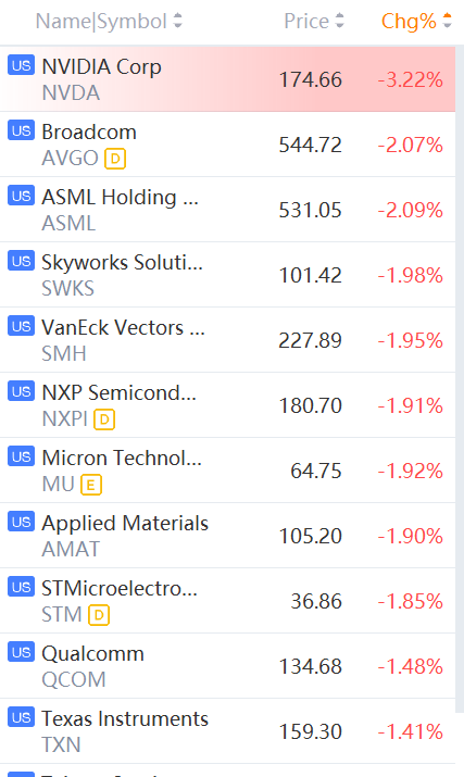 Nvidia, Broadcom, ASML, Micron, Qualcomm, STM, Skyworks and Applied Materials fell between 1% and 3%.