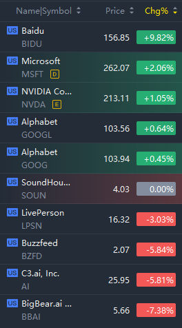 ChatGPT stocks mixed in morning trading; Baidu surged nearly 10% while BigBear.ai Holdings crashed over 7%.