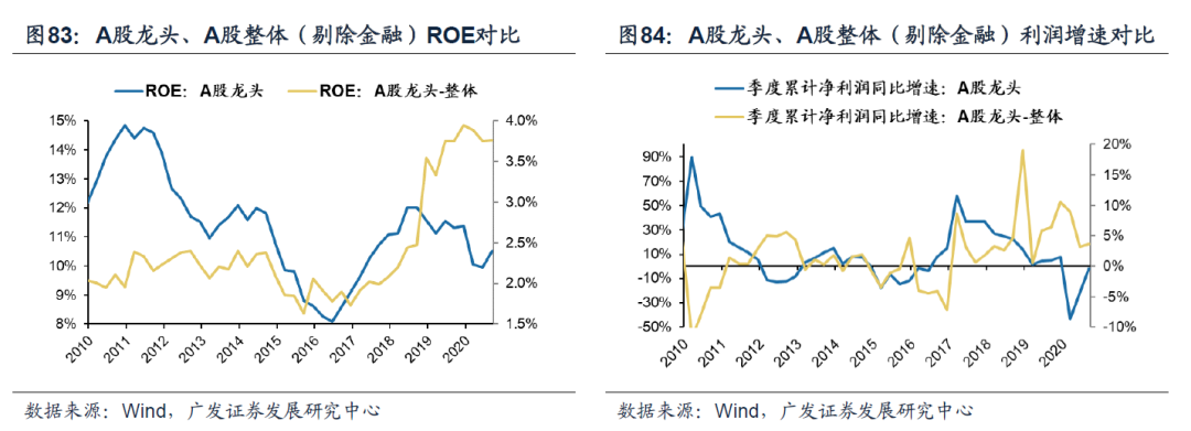 A股龙头盈利能力持续改善,行业龙头强者恒强。随着供给侧改革的深入,成本的增加给行业内部带来结构性的转变,龙头企业受益于资金充裕、技术储备、规模优势,最终实现行业集中度的整体提升。随着竞争格局的改善,龙头话语权逐步明显。2017年以来,A股龙头优势凸显,相对A股整体盈利能力(ROE、利润增速)明显提升,龙头盈利跑赢整体,ROE领先近4pct。
