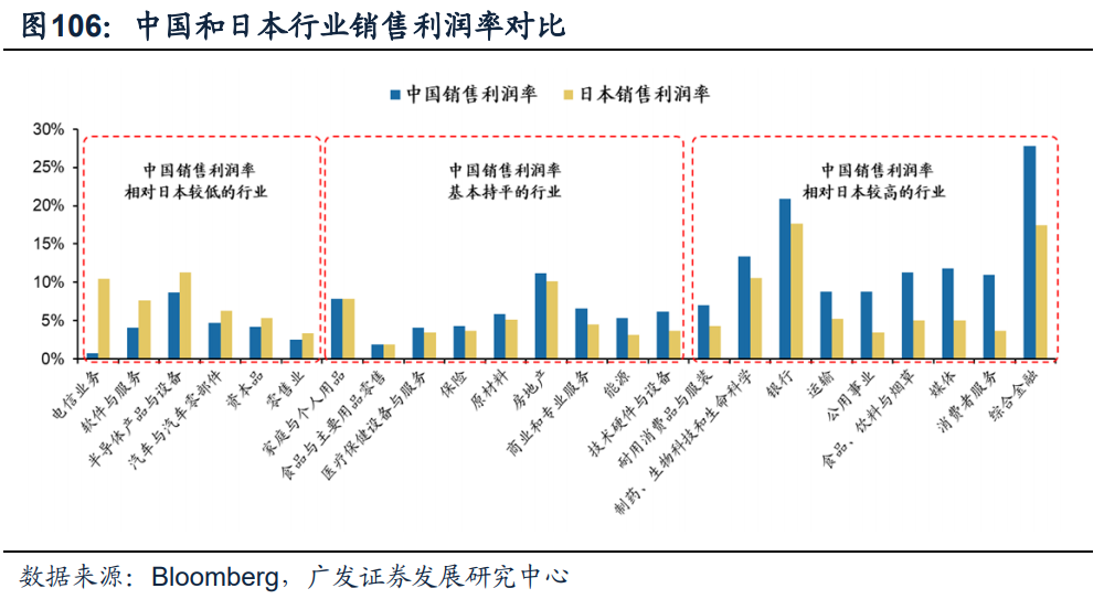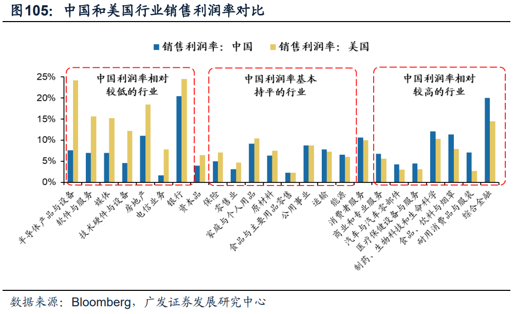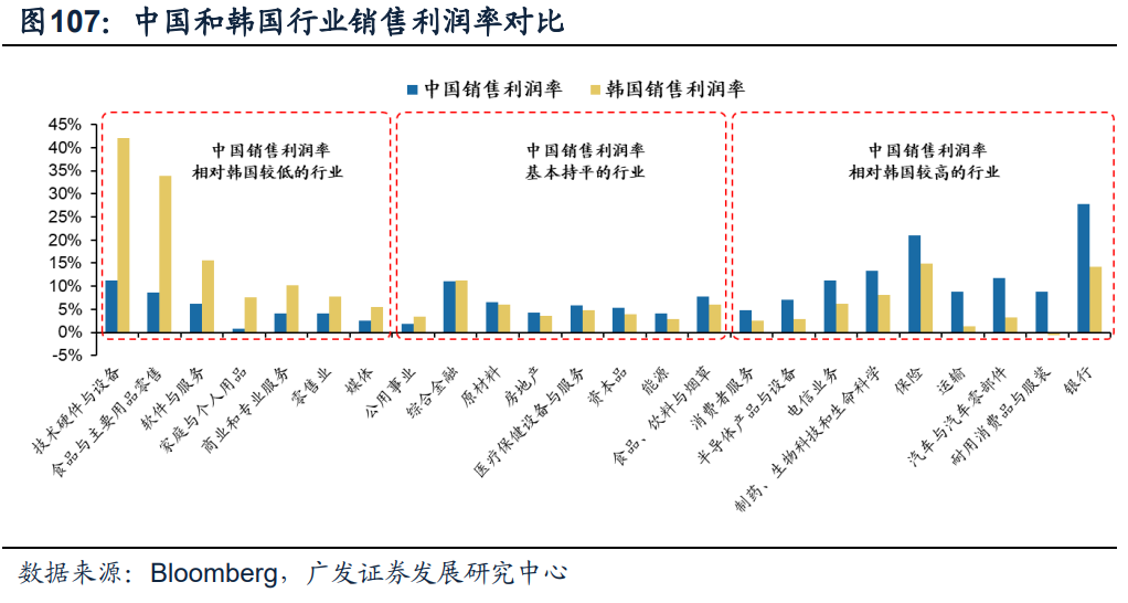 与日韩对比,中国中端制造行业的利润率仍然偏低,也存在赶超市场。根据GICS行业组,我们对比了中国和以日韩为代表的中端制造国家利润率情况,同样可以将中国的行业分为3类——(1)中国仍处国际“价值链”落后的行业(中端制造业)。(2)中国在国际“价值链”上基本与日韩接轨的行业(一般消费品+低端制造业),其中部分行业属于全球价值链中较为低端的品种,基本和日韩拉不开差距;(3)由于市场结构和行业垄断等原因,中国在部分行业的利润率高于日韩(耐用品消费业+生物医疗业+金融行业)。据此,我们认为,中国在中端制造行业具有一定的发展空间。消费和科技产业利润率的提高将为中国经济的增长提供新动能。