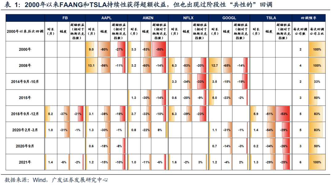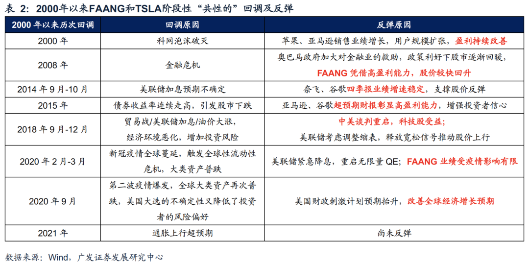 美股FAANG(&Tesla)历史上出现过几次阶段性“共性的”回调。2000年以来,FAANG以及特斯拉共有8次共同的大幅度的“共性的”回调(即部分时间段多数公司基于市场共同的原因一起回调):比如20年“科网泡沫”破裂导致了2次共性的回调;08年金融危机也导致了非常显著的共性回调;14年开始美联储启动缩表进程后,FAANG(&Tesla)也在随后的几年当中出现了几次较为显著的共性的回调。20年疫情全球蔓延的2-3月以及随后的9月,FAANG(&Tesla)也出现了较为显著的共性的回调。