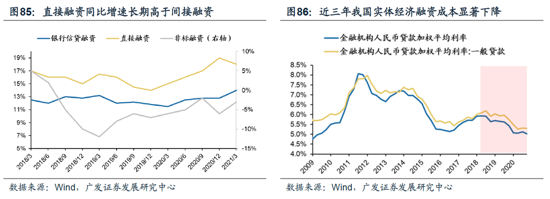 “金融供给侧改革”显著降低实体融资成本:近三年我国金融机构人民币贷款加权平均利率持续下行。金融供给侧改革以来,我国信贷增量明显扩面,直接融资增速长期显著高于间接融资,同时金融监管力度增强,非标融资压降明显,金融系统稳定性明显提升,融资结构持续向更均衡的方向发展。我们判断,“金融供给侧改革”降低实体融资成本,一定程度上也夯实了中国核心资产的估值基础(甚至出现了泡沫化的倾向)。