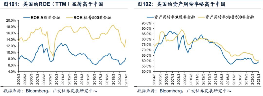 对比中美两国ROE结构,美股盈利能力持续高于中国:主要因为美国企业占据全球价值链高位,而中国企业以“量”取胜,销售利润率远低于美国。通过杜邦拆解可以看到——A股剔除金融的资产周转率和资产负债率均显著高于标普500,这是由于我国企业高周转和高杠杆的经营模式决定的;而A股上市公司大多仍处于全球分工体系偏下的位置,毛利率相对较低,导致A股剔除金融的销售利润率远低于标普500。