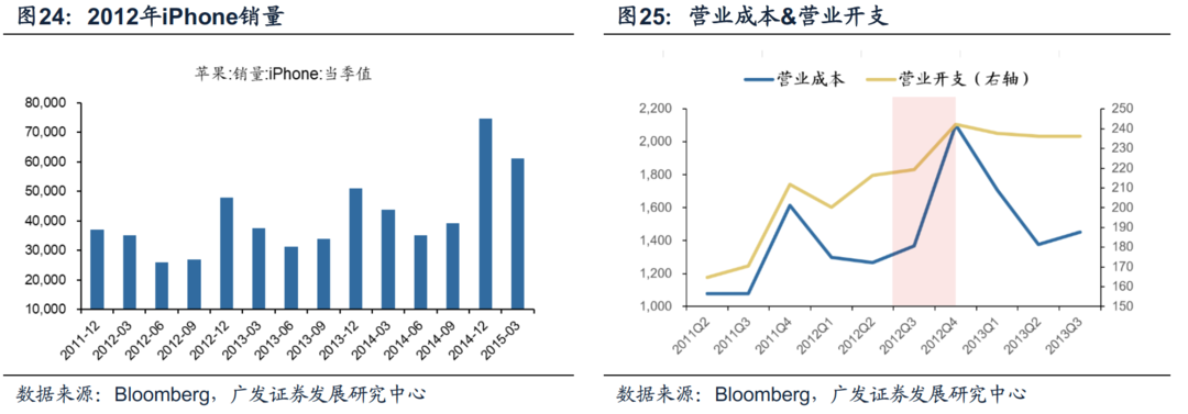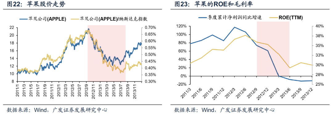 新机型销量不佳而研发成本攀升,业绩下滑引发股价下跌。iPhone5发布后销量不佳,12年四季度销量仅为2700万台,低于市场预期1000-1500万台。同时,由于在世界范围内开设大量旗舰店,雇佣更多的员工,调整产品线等一系列原因,苹果的营业成本和营业开支大幅攀升,导致苹果四季度利润增速大幅减少,ROE下行,引起股价的一波下跌。从2012年9月开始的约半年间,苹果股价最多跌去44%,近乎腰斩。