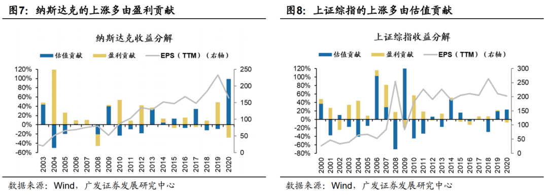美股整体由盈利驱动,而A股整体在2010年以后基本由估值驱动。我们拆解了美股(纳斯达克指数)和A股(上证综指)过去20年的年度涨跌幅的驱动因素,可以看到:(1)美股年度收益率在多数年份是由盈利驱动的,只有在少数年份由估值驱动(仅有03年、09年、13年、17年和20年);(2)A股的年度收益率在2010年以前基本是由盈利驱动的(增量经济时代),而在2010年以后则基本由估值驱动(存量经济时代)。
