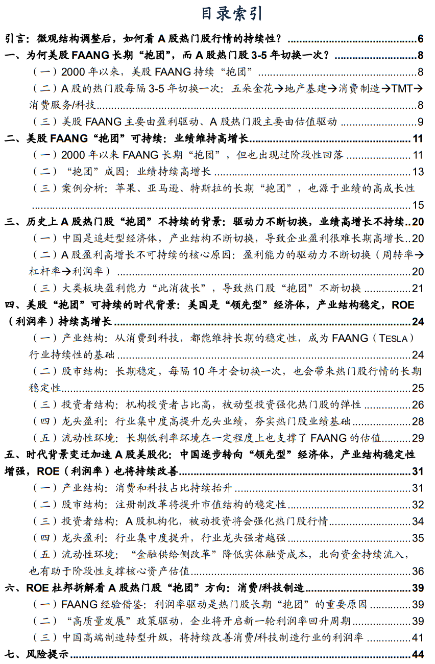 我们判断:中国高质量发展,逐步从“追赶型”经济体转向“领先型”经济体,产业结构稳定性增强,利润率持续改善的消费/科技制造的“抱团”行情有望延续。中国消费和科技的产业结构比重逐步抬升。随着注册制改革推进,A股消费/科技制造行业的利润结构也将得到优化。中国投资者也在加速机构化,被动投资也会强化热门股行情。同时,行业集中度提高以及贴现率下行的长期趋势,也会夯实热门股“抱团”的业绩和估值基础。借鉴FAANG经验,利润率驱动是热门股长期“抱团”的重要原因。“混合型”财政/“国内大循环”/高端制造升级将会开启中国消费/科技制造业较长利润率回升周期。A股长期“抱团”方向:利润率潜在改善的大众消费和高端制造。