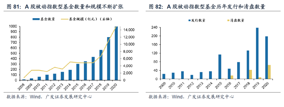 A股当前主动型基金为主,被动产品仍在发展中。随着国内市场的不断成熟,通过主动管理来战胜市场指数获取超额收益变得愈发困难。近10年来,指数基金产品市场加速发展,产品数量逐年增加,产品规模不断扩大,跟踪的指数类型也日益丰富。2009年发行的产品总数超过了以往所有年份的产品数量之和,并在2015年牛市顶点达到6700多亿元。随着A股市场被纳入MSCI指数体系,未来总体被动指数型基金的管理规模将再次大幅度增加,有助于提升A股的机构化水平,并进一步强化热门股的“抱团”行情。