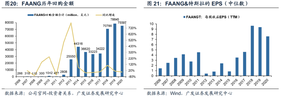 (3)股份回购:利润水平较高的情况下,进一步增强FAANG(&Tesla)的EPS。企业回购会减少股票数量,在(移动)互联网红利下,FAANG(&Tesla)的盈利能力持续改善,而股份回购能够进一步强化这些公司的EPS。同时,股份回购也会在一定程度上提振投资者信心,增强FAANG(&Tesla)公司股价的稳定性。从FAANG历年回购金额同比变动趋势和EPS走势看较为接近,回购反映在EPS的增长上具有一定的时滞性:13年起,FAANG整体的回购规模大幅提高,对应EPS也逐步提升,18年起回购金额和EPS均维持在相对高位。