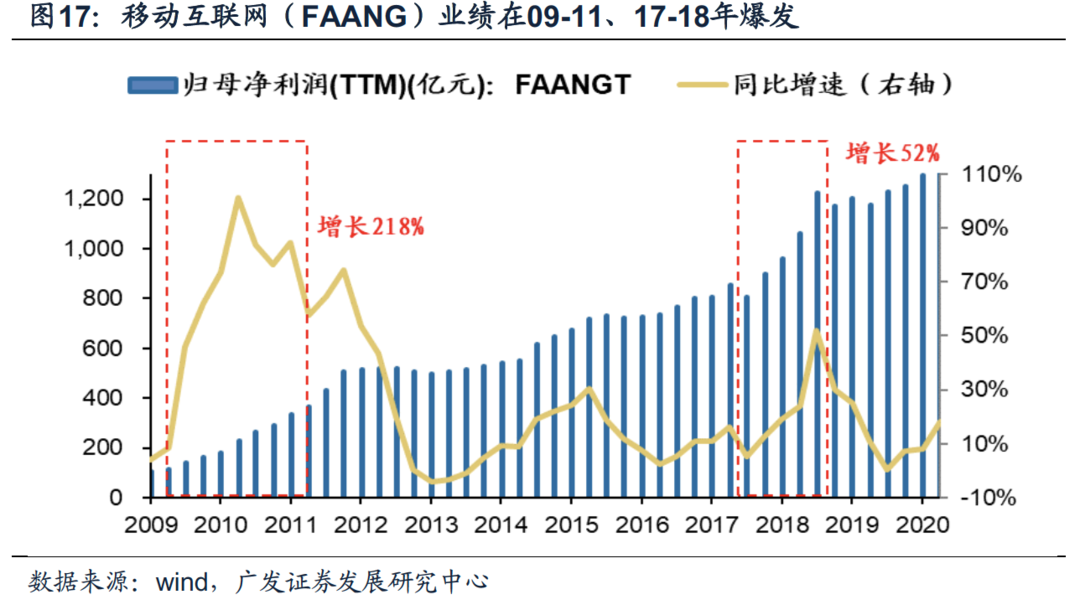 (1)(移动)互联网红利:2000年以来的互联网红利和2010年以来的移动互联网红利,持续优化FAANG(&Tesla)的盈利(预期)。1990年代以来,美国便已占据了信息技术的科技高点,持续享受互联网红利,“科网泡沫”破裂后,部分互联网公司(谷歌、亚马孙等)的盈利能力得到不断验证,逐步成为市场“抱团”的焦;2009-11年移动互联网时代开启,推动FAANG的盈利进入加速上行期。具有研发优势的科技股在09-11年和18-19年业绩均有大爆发,尤其FAANG的净利润增长强劲:09年12月-11年12月以及18年3月-19年3月,FAANGT归母净利润分别涨超200%和50%。