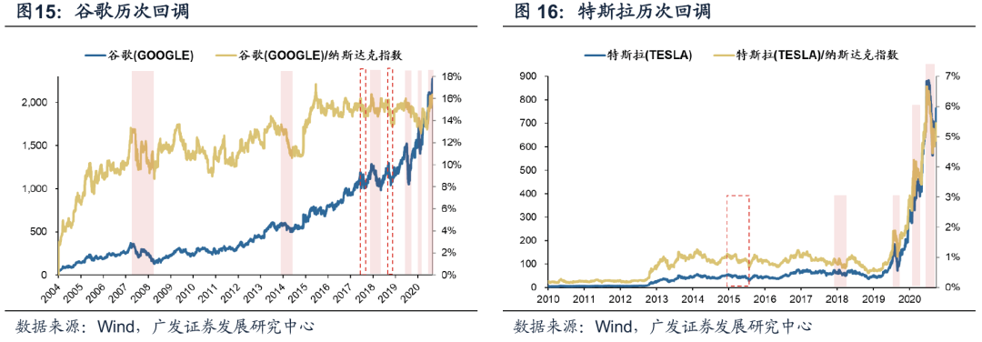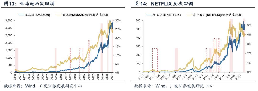 除了“共性的”回调以外,部分FAANG(&Tesla)个股也出现过“个性的”回调。FAANG(&Tesla)总共有13次“个性的”回调(即特定时间段只有个别公司基于公司本身逻辑出现的单独的回调)。其中,亚马逊和Netflix发生“个性的”单独回调的次数相对较多。从数据上来看,FAANG(&Tesla)的“共性的”回调相比于“个性的”回调,其回调幅度一般会更大。由此可见,FAANG的“抱团”呈现出较强的一致性,个别公司阶段性波动(回调)对整体的影响较小。