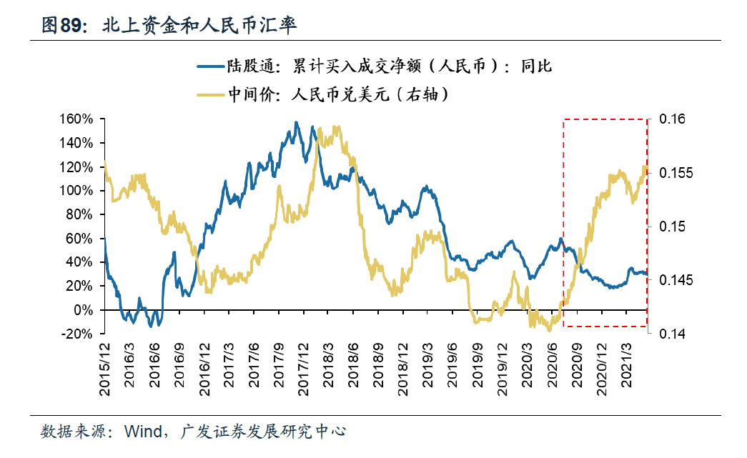 16年以来北上资金持续流入,在一定程度上也能持续强化A股的热门股行情。16年以来的数据显示,北上资金净流入额的边际变化基本和人民币汇率相关,但从20年以来这种相关性相对弱化。我们认为,随着人民币汇率升值预期持续抬升,北向资金持续流入的预期将会得到增强。
