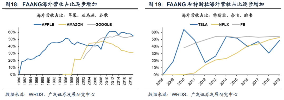 (2)海外业务扩展:FAANG不断扩宽海外市场,海外营收占比逐年增加。FAANG和特斯拉上市以来,海外营收占比总体从0%(除谷歌和脸书在30%左右)逐步提高至50-60%。全球化布局带来了持续强劲的盈利能力。