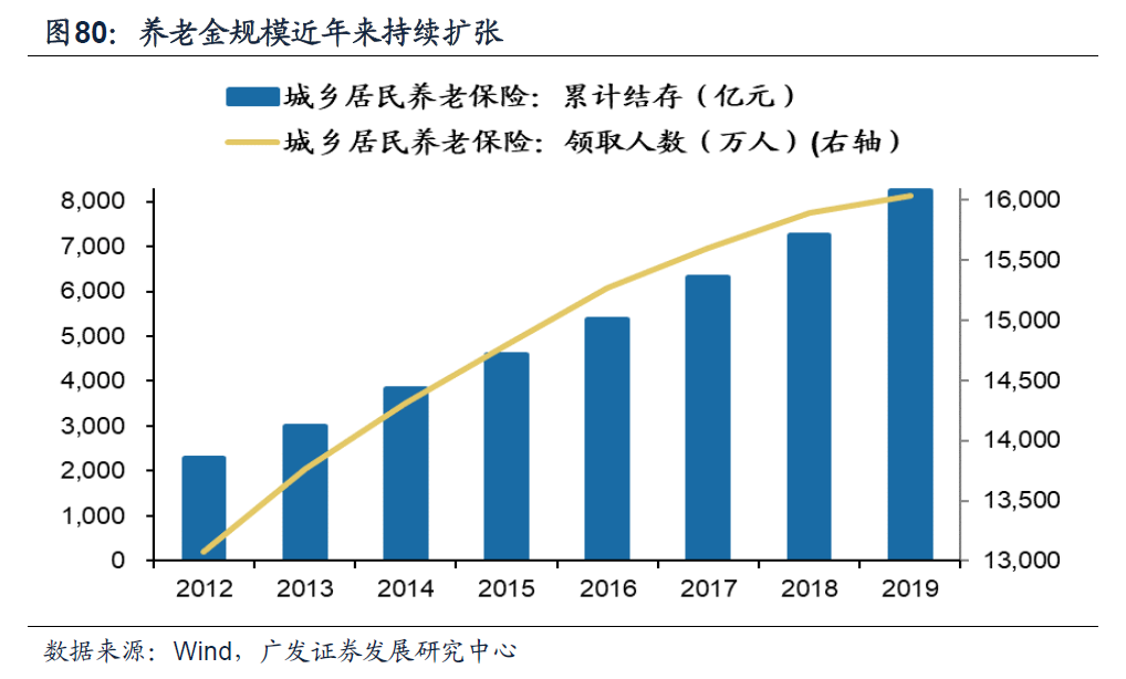 我国养老金的崛起促进A股机构化进一步加速。我国养老保险的规模和参与人数自12年以来逐年持续、稳定地扩张,至19年城乡居民养老保险规模超8000亿元,人数达1.6亿人。借鉴美股,个人账户养老金发展有望带动我国资产结构向长期化转型,并提供长期稳定的资金来源,推动机构化发展。