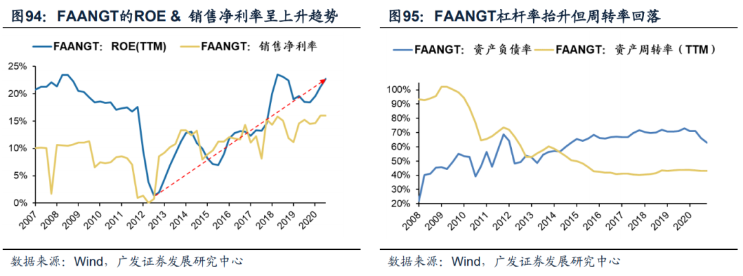 美股FAANG的ROE持续走高,热门股“抱团”根本上来源于利润率持续改善。FAANGT的ROE自2012年以来得到显著提高,基于杜邦三因素拆解,ROE的提高主要由销售净利率贡献,二者走势高度相关。而ROE的增幅则受资产周转率下降拖累。我们认为:相较杠杆率和周转率的窄幅波动,ROE的持续走高主要是由利润率驱动的。