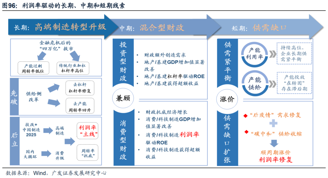 高质量发展/混合型财政/供需缺口,A股将开启新一轮利润率回升周期。我们在2019.4.29发布的《“稳”民企,“兴”制造》中指出:高质量发展(高端制造转型升级)将中长期提升A股上市公司的利润率水平——中国经济增长的驱动力,以08年金融危机为界,可以分为周转率驱动和杠杆率驱动。在08年以前,凭借加入WTO的东风,中国经济出口导向为主,周转率大幅抬升持续改善ROE水平;而在08金融危机之后,中国经济更加依赖地产、基建加杠杆,通过提升杠杆率维持相对较高的ROE水平。当前,中国经济越来越接近长债务周期拐点,经济体量全球第二,很难再通过加杠杆或高周转维持较高的ROE水平。从ROE杜邦三因素出发,高端制造转型升级提升中国企业在全球“价值链”的位置,能够中长期改善企业利润率水平(科技含量)。我们在2020.4.21《混合型财政,A股能否刻舟求剑?》中指出:20年中国财政将兼顾“投资型/消费型”,也将改善企业(尤其是消费/科技制造业)的利润率水平——相较于08年“4万亿”投资者财政驱动地产/基建加杠杆(杠杆率),我们判断:20年混合型财政托底经济“稳增长”,面向企业救助和居民纾困,通过刺激消费需求(并托底部分制造企业的投资),拔高消费/制造行业的利润率(改善ROE)。我们在2021.1.18《产能视角看行业“供需缺口”》以及2021.3.19《产能视角看“碳中和”投资机会》中指数:21年“供需缺口”扩张顺周期涨价则短期支撑顺周期企业利润率持续高位——16-17年的“供给侧改革”以及18年以来的供给收缩常态化政策下,企业的产能(固定资产同比增速)持续低位,而产能利用率则高位回升。较高的产能利用率使得企业经营长期处于“供需紧平衡”的状态,因此,无论是“后疫情”需求修复还是“碳中和”供给收缩,都会导致企业的“供需缺口”扩张,进而带来顺周期涨价行情/预期(利润率抬升)。