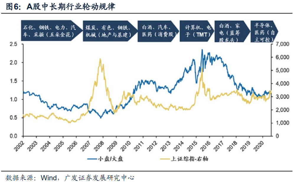 从2000年以来,A股的热门股出现过大致6次切换,基本是每隔3-5年会有一次热门股轮动。A股热门股在过去20年里不断迭代,每一轮热门股行情都基本映射了当时鲜明的时代背景——(1)2000年初中国加入WTO,外贸型经济带来了以煤炭、钢铁、有色等为代表的“五朵金花”行情;(2)08年金融危机之后,“4万亿”财政刺激计划带来了地产和基建的“加杠杆”行情;(3)在10-12年的盈利下行周期中,消费制造业的盈利能力超越周期品,引领了白酒、汽车和医药的消费股行情;(4)13-15年外延式并购爆发,则带来了计算机、电子为代表的科技股行情;(5)16年以来随着行业集中度进一步抬升,白酒、家电等蓝筹龙头股再次行为市场“新宠”;(6)19年“金融供给侧改革”降低实体融资成本,贴现率下行叠加中美贸易摩擦,半导体、医药等自主可控板块又持续受到市场追捧。由此可见,由于中国是典型的追赶型经济体,随着产业结构不断变迁,资本市场的热门股也会持续切换,在一定程度上带来中美热门股的核心差异:美国FAANG行情能够持续长达20年,而中国的热门股行情则每隔3-5年就会面临一次重新“洗牌”。