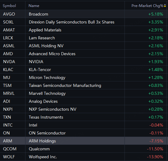 Broadcom up 5%; Applied Materials, SOXL up 3%; ASML, AMD, Nvidia up 2%; Micron, Marvell up 1%; ARM down 7%; Qualcomm down 12%; Wolfspeed down 14%.