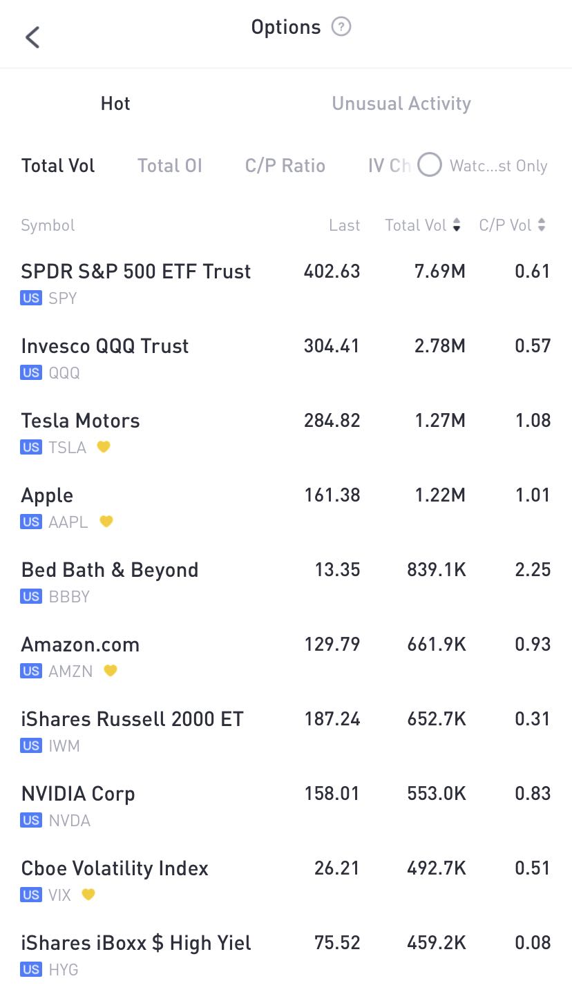 Top 10:SPY, QQQ, TSLA, AAPL, BBBY, AMZN, IWM, NVDA, VIX, HYG