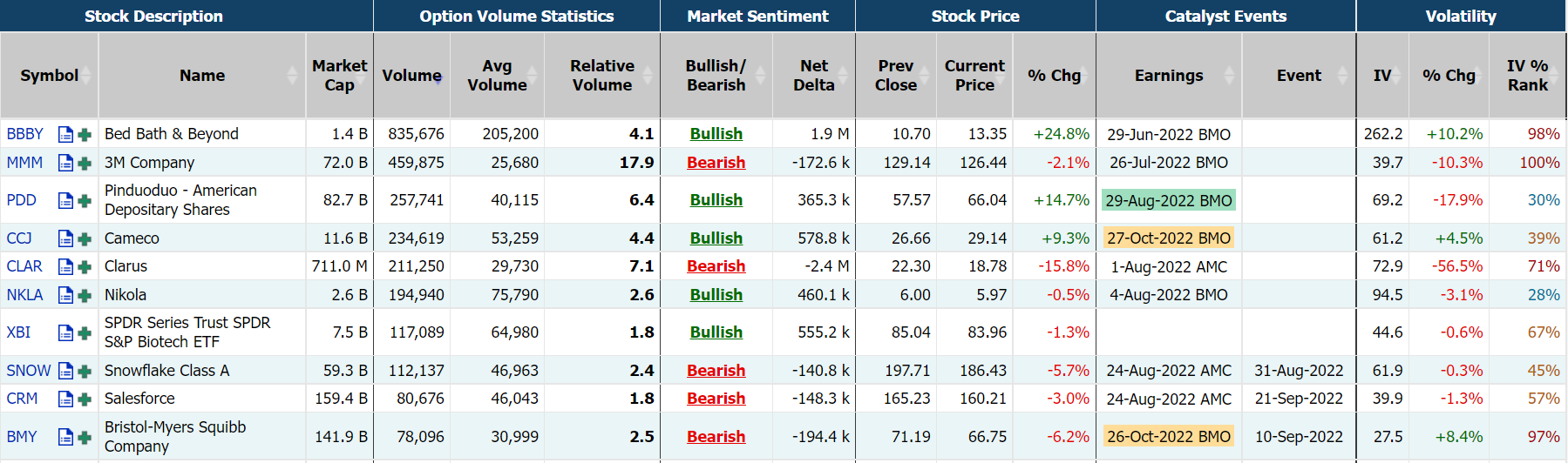 This report shows stocks with the highest volume of bullish and bearish activity by option delta volume, which converts option volume to an equivalent stock volume (bought or sold).