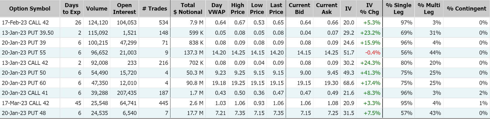 新兴市场ETF-iShares MSCI周三期权成交98.58万张合约,看涨期权占比逾44.2%;其中2023年2月17日到期的42美元行使价看涨期权的成交量特别高,成交量为12.41万张。