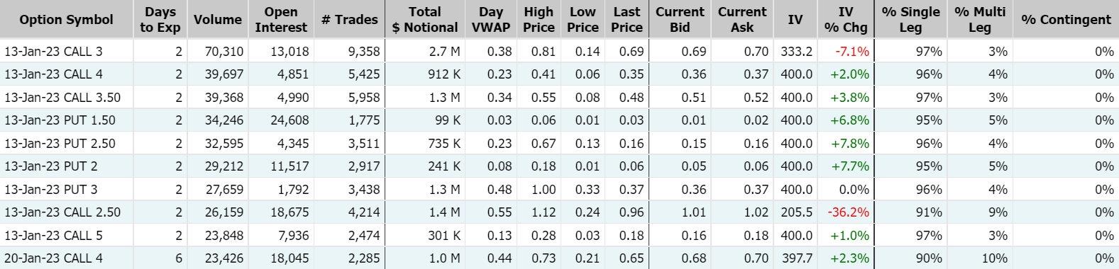 3B家居收涨逾68%,创该公司美国IPO以来最大单日涨幅,此前计划裁员以额外削减至多1亿美元的成本;周三期权成交99.77万张合约,较90日平均成交量放大逾7倍,其中看涨期权占比66%;其中2023年1月13日到期的3美元行使价看涨期权的成交量特别高,成交量逾7万张。