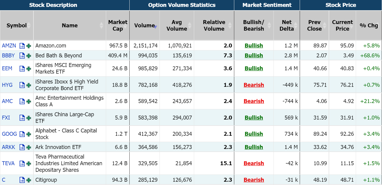 周三,期权市场总成交量4583万张合约,环比前一交易日大幅上涨,且高于90日平均成交量;3B家居期权成交99.77万张合约,较90日平均成交量放大逾7倍,其中看涨期权占比66%;隔夜大型科技股普涨,特斯拉、亚马逊、苹果期权成交量均大幅回升。