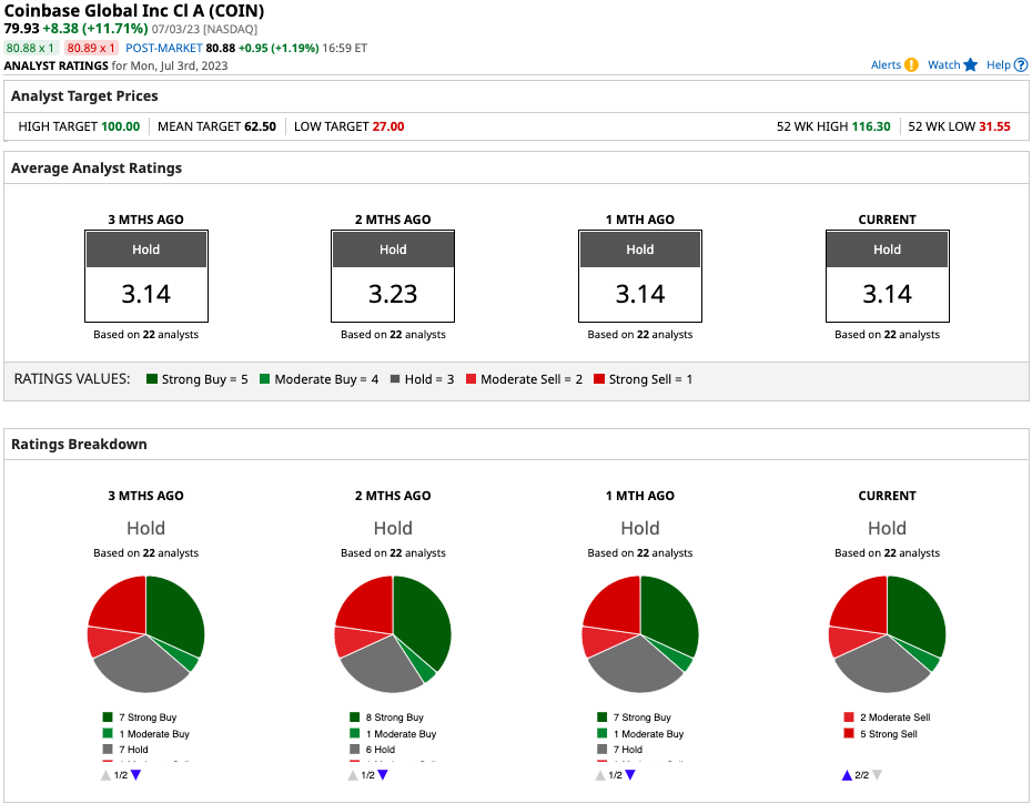 Analysts are, however, much more cautious about Coinbase. Out of the 22 analysts covering COIN stock, seven recommend a “strong buy”, one recommends a “moderate-buy”, seven recommend a “hold”, two recommend a “moderate sell,” and five recommend a “strong sell”.