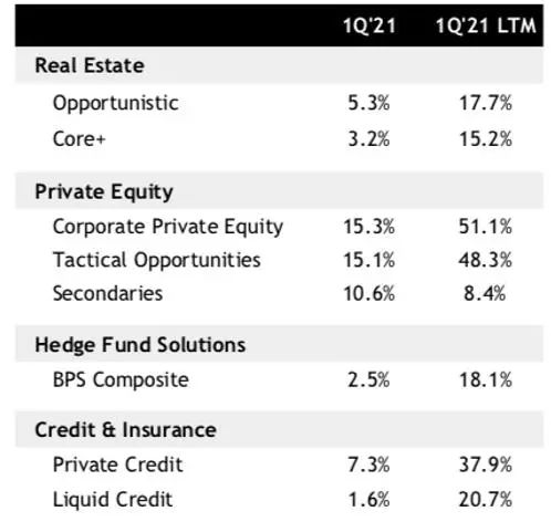 在投资表现上,私募股权板块业绩尤其突出。根据财报,2021年第一季度,来自PE业务及战术机会投资的涨幅均超过了15%。其不动产板块下的机会型与与核心增益型策略涨幅分别为5.3%及3.2%。