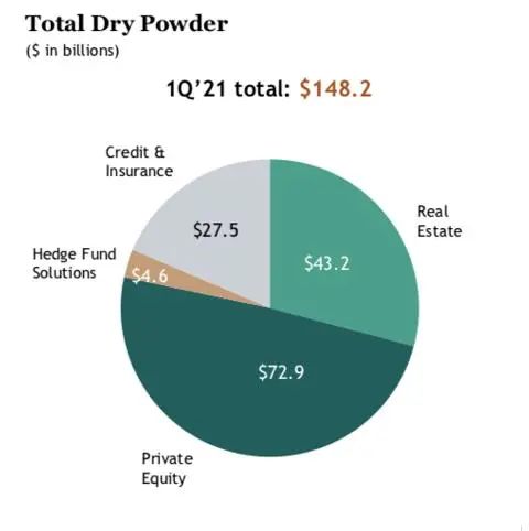 财报显示,2021年Q1,黑石的全部Dry Powder(干火药)为1482亿美元(约合9626亿人民币)。其中,私募股权板块的干火药为729亿美元,不动产业务则为432亿美元。