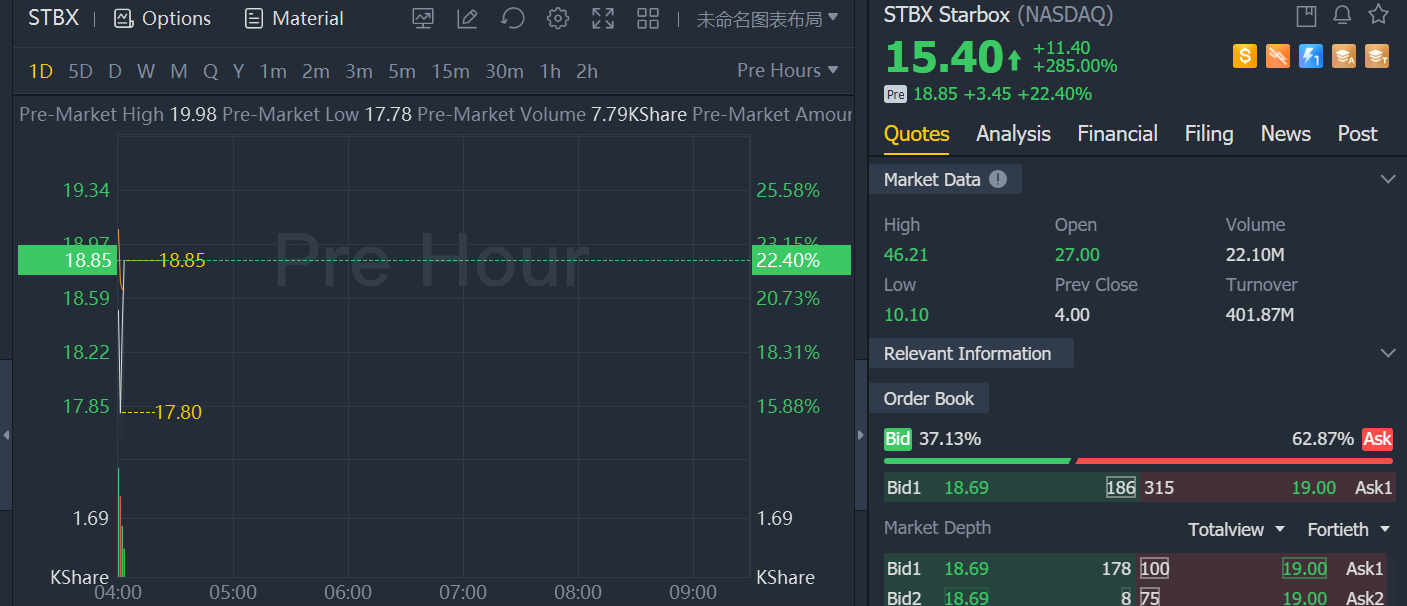 Starbox shares jumped 22% in premarket trading. The shares soared nearly 290% on the first day of listing.