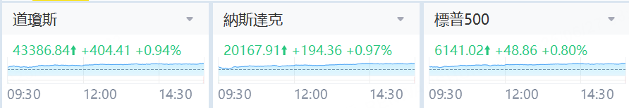 美东时间周四,美股三大指数集体收涨,标普500指数与纳指均接近历史新高。截至收盘,道指涨404.41点,涨幅为0.94%,报43386.84点;纳指涨194.36点,涨幅为0.97%,报20167.91点;标普500指数涨48.86点,涨幅为0.80%,报6141.02点。