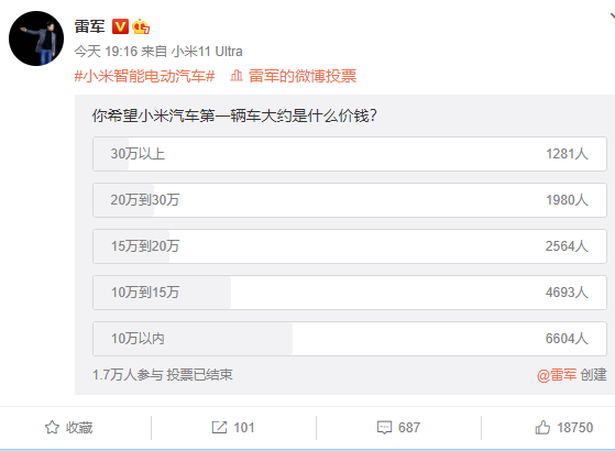 首款产品会卖多少钱?在4月6日晚的直播中,雷军表示,“微博投票结果显示,粉丝希望我们做中高端的汽车,因此第一款小米汽车价格区间为10万-30万元。”