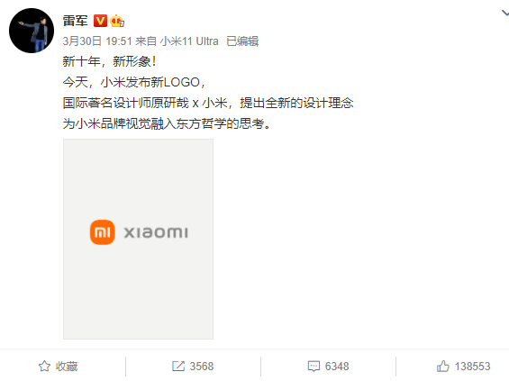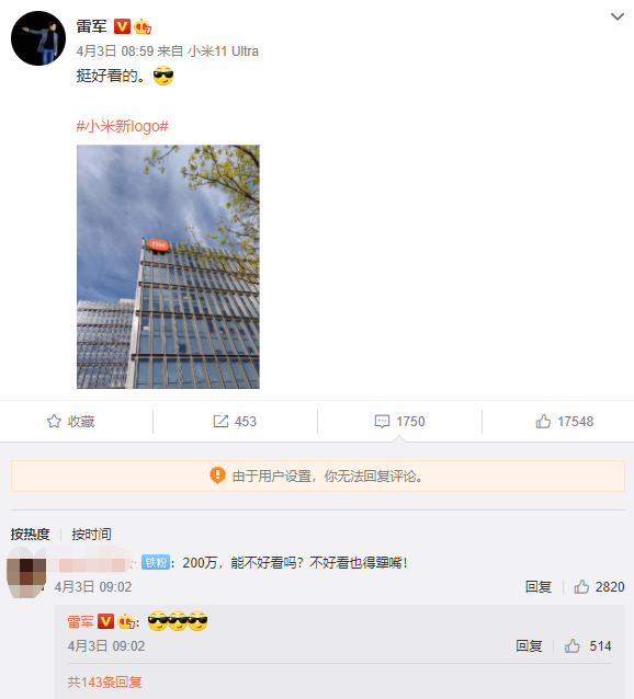 清明假期第一天,“劳模”雷军在微博上晒出了小米总部的新Logo,称“挺好看的”。