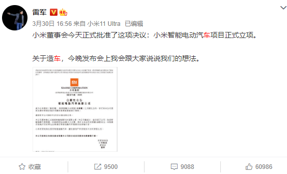 3月30日晚,小米春季新品发布会上,小米创办人,董事长兼CEO雷军公布了一个重磅消息——小米决定进军汽车整车制造行业。