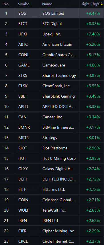 Crypto Shares Rebound. SOS up 9%; BTCT up 8%; UPXI up 7%; ABTC and CONL up 5%; BMNR, Riot, Coinbase and Strategy up 3%; Circle up 2%.