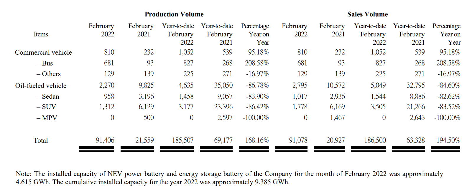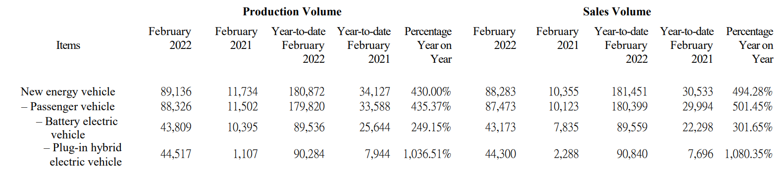 BYD today reports that the total production and sales volume of the Company for the month of February 2022 (Units):