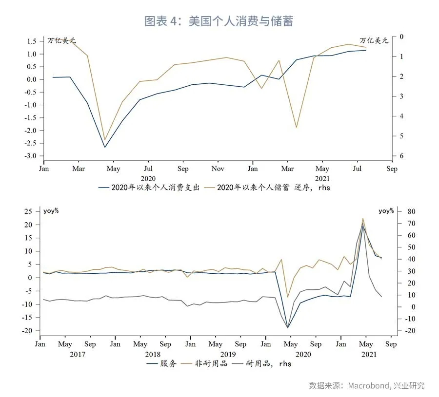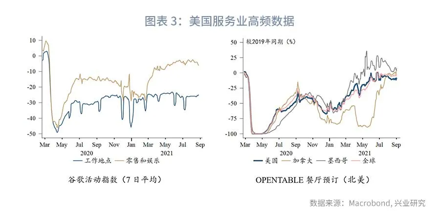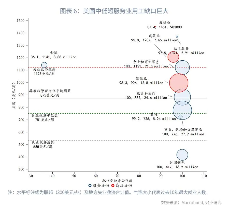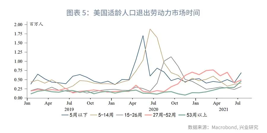 从服务业供给端而言,美国劳动力市场似乎陷入某种怪圈:失去财政援助后消费走弱,使得劳动力需求减少(前文所述);但高额的财政援助又使得越来越多的适龄人口退出劳动力市场,用工缺口持续存在。目前的奇怪现象是,尽管8月服务业就业表现惨淡,但大量中低端服务业用工缺口仍在历史高位。一个可能的解释是,9月6日后额外失业救济将停发,大量适龄人口将被迫重返劳动力市场。面对近期薪资快速上涨,企业主并不愿意增加雇佣,而是选择等待劳动力市场重回平衡。