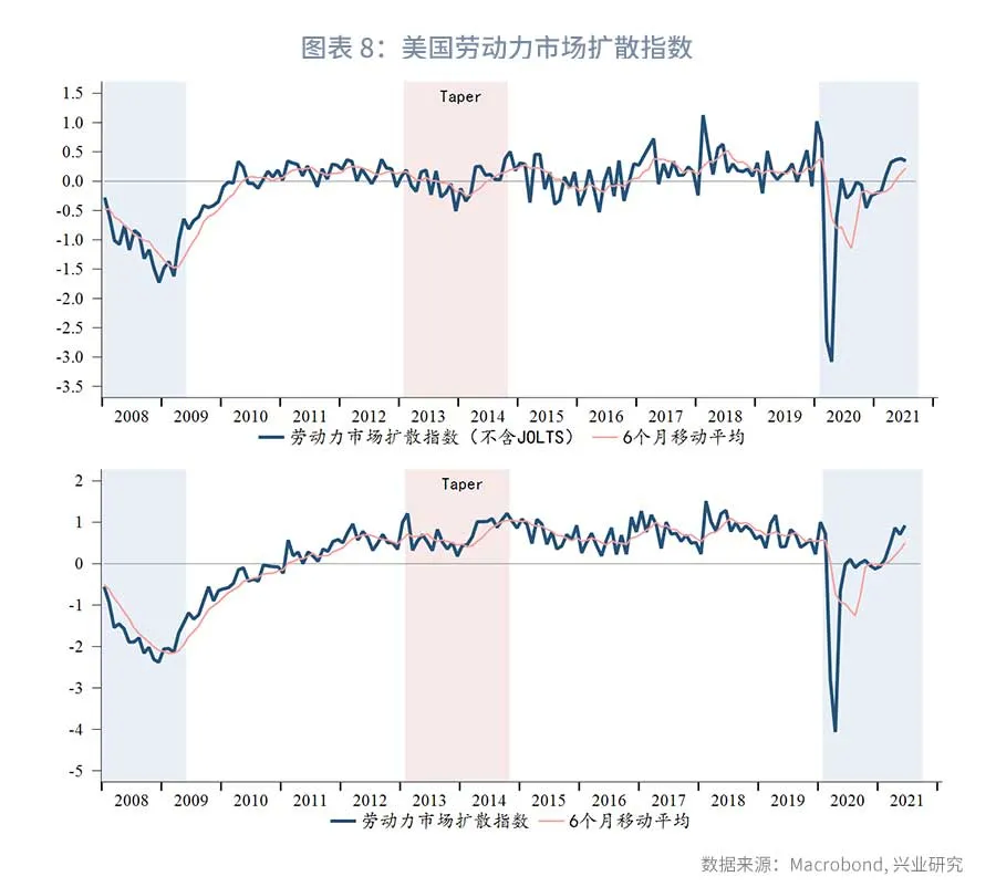美国财长耶伦并不认为额外失业救济磋商了就业积极性,甚至鼓励州和地方政府动用此前财政刺激案中的“美国拯救计划(AmericanRescue Plan)”下发给州和地方政府的剩余资金(大约3500亿美元)继续发放补充失业救济。而目前约有1100万人仍在申领失业救济。这意味着如果全额动用3500亿美元且继续维持每周300美元的救济标准,尚可以继续维持约半年时间。不过目前尚不清楚各州是否会响应耶伦的号召,在6、7月已经有26个州停发额外失业救济,以推动失业者重返劳动力市场。因此,美联储有理由继续观察9月、10月的非农数据是否反映出劳动力市场结构的改善。