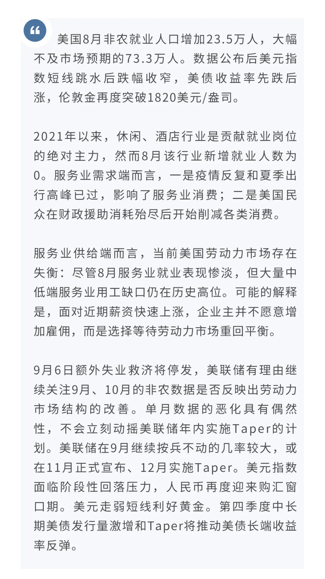 单月数据的恶化具有偶然性,不会立刻动摇美联储年内实施Taper的计划。从劳动力市场全局看,目前复苏势头依然良好,比2013年更加强劲。由于8月数据未达到多位官员提出的新增就业80万人的Taper触发条件,美联储在9月继续按兵不动的几率较大,或在11月正式宣布、12月实施Taper。美元指数面临阶段性回落压力,人民币再度迎来购汇窗口期。美元指数走弱、Taper延至9月后的预期支撑商品价格和通胀预期,短线利好黄金。第四季度中长期美债发行量激增,叠加通胀预期持稳和年内Taper预期仍存,美债长端收益率有望延续反弹。