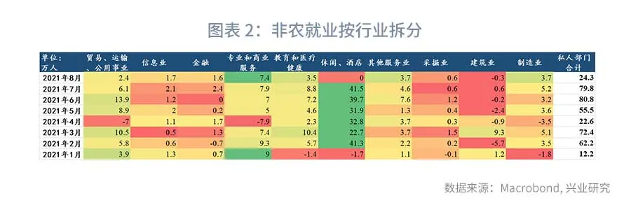 由于本周三早先公布的8月ADP就业已经显著不及预期,市场已经降低了对于非农就业的期待,但最终数据仍然令人大跌眼镜。为何8月非农就业数据如此低迷?从行业分布看,2021年以来,休闲、酒店行业是贡献就业岗位的绝对主力,其次是专业和商业服务、教育和医疗健康等服务业。然而8月休闲、酒店业新增就业人数为0,其他行业的贡献杯水车薪。