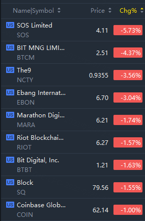 Crypto stocks slipped in morning trading; SOS Limited slid nearly 6% while BIT MNG LIMITED SPON ADS EACH REP 100 SHS CL A (P/S) slid over 4%.