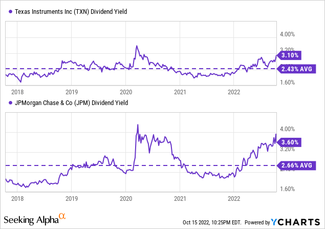 Many terrific companies that should weather a recession just fine have historically high yields. Two favorites are Texas Instruments (TXN), and JPMorgan Chase (JPM), as shown below.