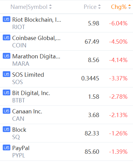 Marathon Digital, Coinbase, SOS Limited, PayPal, and Block fell between 1% and 5%.Bitcoin fell back below $30,000 to the lowest in a week as yet another attempt at upward momentum lost steam amid risk-off markets.